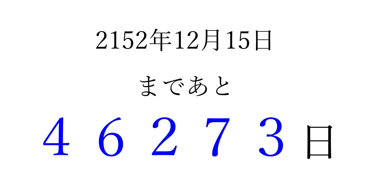 2152年12月15日(金)まで あと 99999 日です 追加すると、トップページからすぐ選べるようになります ※2026/04/07現在の結果です。 最新の状態に更新する ↓シェアして、タイムライン上にカウントダウンを表示しよう!↓ 📤 この結果を共有する Tweet シェア Threads Bluesky 別の日付でカウントダウン 2152年12月のカレンダー このページをブックマークに追加すると、いつでもカウントダウンを確認できます。 (PC: Ctrl+D / Mac: ⌘+D) hitome-notes.comでは以下のページも運営しています。 指定日と期間から日付を計算 | ガチャ確率計算・シミュレーション | プライバシー・ポリシー 運営者:Avocado