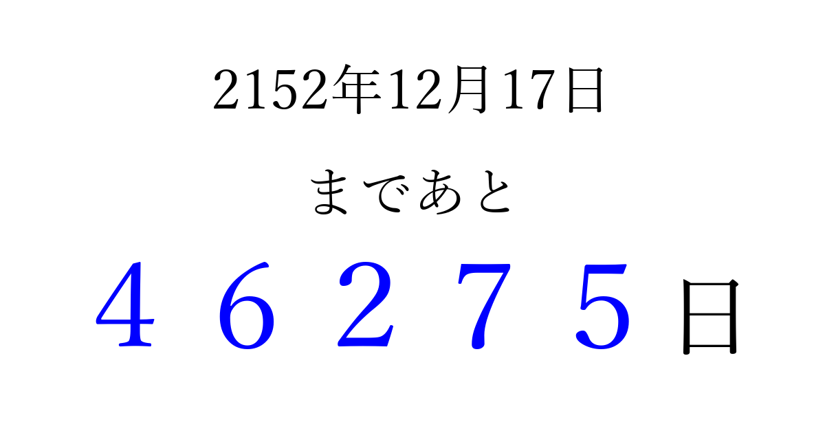 2152年12月17日(日)まで あと 99999 日です 追加すると、トップページからすぐ選べるようになります ※2026/04/07現在の結果です。 最新の状態に更新する ↓シェアして、タイムライン上にカウントダウンを表示しよう!↓ 📤 この結果を共有する Tweet シェア Threads Bluesky 別の日付でカウントダウン 2152年12月のカレンダー このページをブックマークに追加すると、いつでもカウントダウンを確認できます。 (PC: Ctrl+D / Mac: ⌘+D) hitome-notes.comでは以下のページも運営しています。 指定日と期間から日付を計算 | ガチャ確率計算・シミュレーション | プライバシー・ポリシー 運営者:Avocado