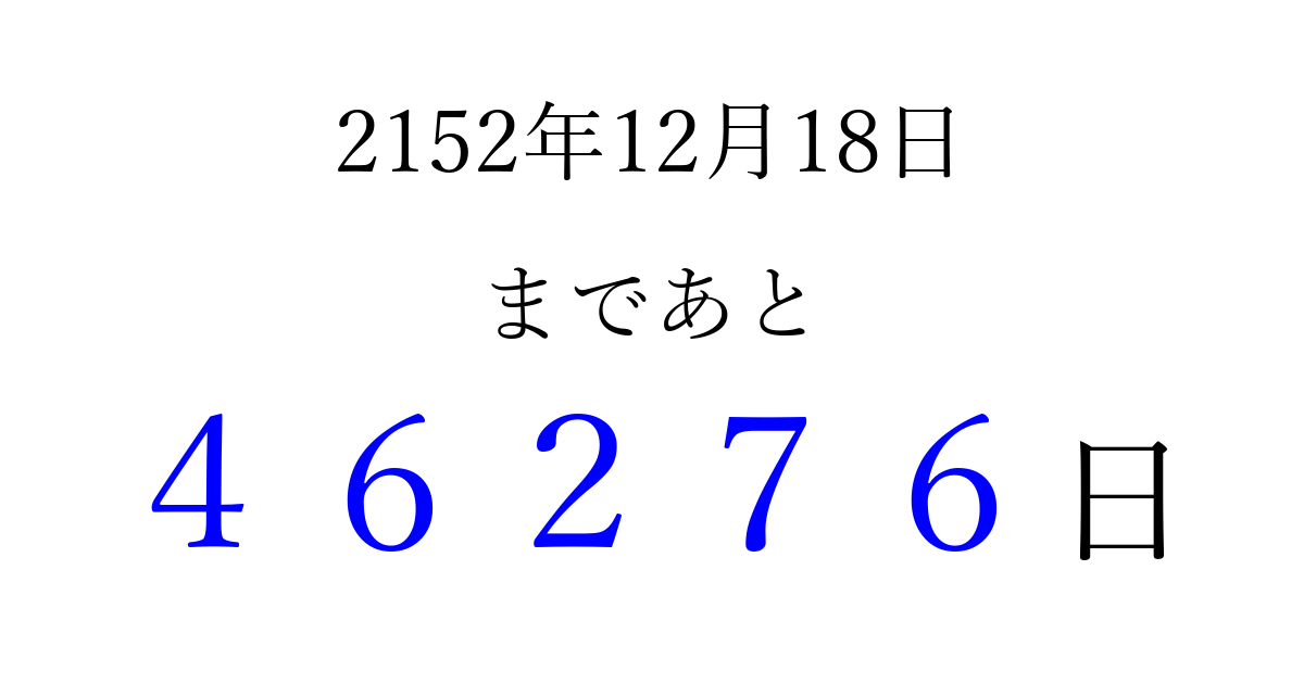 2152年12月18日(月)まで あと 99999 日です 追加すると、トップページからすぐ選べるようになります ※2026/04/07現在の結果です。 最新の状態に更新する ↓シェアして、タイムライン上にカウントダウンを表示しよう!↓ 📤 この結果を共有する Tweet シェア Threads Bluesky 別の日付でカウントダウン 2152年12月のカレンダー このページをブックマークに追加すると、いつでもカウントダウンを確認できます。 (PC: Ctrl+D / Mac: ⌘+D) hitome-notes.comでは以下のページも運営しています。 指定日と期間から日付を計算 | ガチャ確率計算・シミュレーション | プライバシー・ポリシー 運営者:Avocado