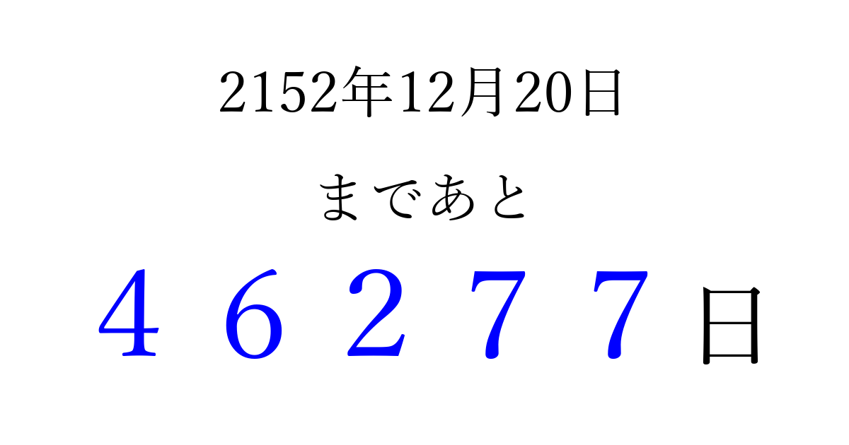 2152年12月20日(水)まで あと 99999 日です 追加すると、トップページからすぐ選べるようになります ※2026/04/08現在の結果です。 最新の状態に更新する ↓シェアして、タイムライン上にカウントダウンを表示しよう!↓ 📤 この結果を共有する Tweet シェア Threads Bluesky 別の日付でカウントダウン 2152年12月のカレンダー このページをブックマークに追加すると、いつでもカウントダウンを確認できます。 (PC: Ctrl+D / Mac: ⌘+D) hitome-notes.comでは以下のページも運営しています。 指定日と期間から日付を計算 | ガチャ確率計算・シミュレーション | プライバシー・ポリシー 運営者:Avocado