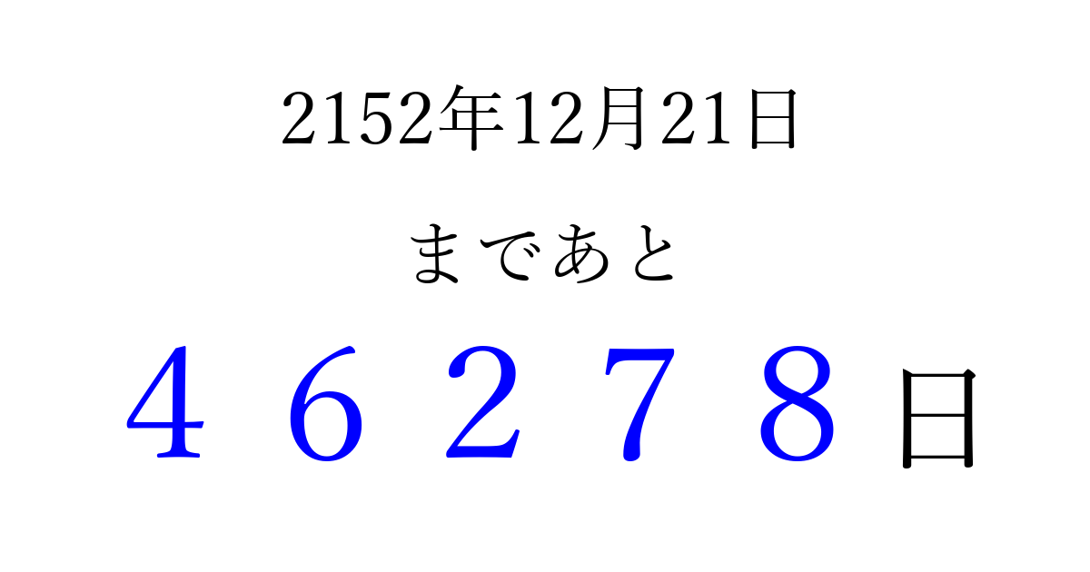 2152年12月21日(木)まで あと 99999 日です 追加すると、トップページからすぐ選べるようになります ※2026/04/08現在の結果です。 最新の状態に更新する ↓シェアして、タイムライン上にカウントダウンを表示しよう!↓ 📤 この結果を共有する Tweet シェア Threads Bluesky 別の日付でカウントダウン 2152年12月のカレンダー このページをブックマークに追加すると、いつでもカウントダウンを確認できます。 (PC: Ctrl+D / Mac: ⌘+D) hitome-notes.comでは以下のページも運営しています。 指定日と期間から日付を計算 | ガチャ確率計算・シミュレーション | プライバシー・ポリシー 運営者:Avocado