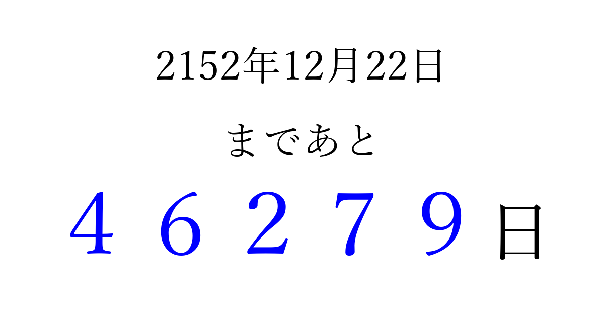2152年12月22日(金)まで あと 99999 日です 追加すると、トップページからすぐ選べるようになります ※2026/04/08現在の結果です。 最新の状態に更新する ↓シェアして、タイムライン上にカウントダウンを表示しよう!↓ 📤 この結果を共有する Tweet シェア Threads Bluesky 別の日付でカウントダウン 2152年12月のカレンダー このページをブックマークに追加すると、いつでもカウントダウンを確認できます。 (PC: Ctrl+D / Mac: ⌘+D) hitome-notes.comでは以下のページも運営しています。 指定日と期間から日付を計算 | ガチャ確率計算・シミュレーション | プライバシー・ポリシー 運営者:Avocado