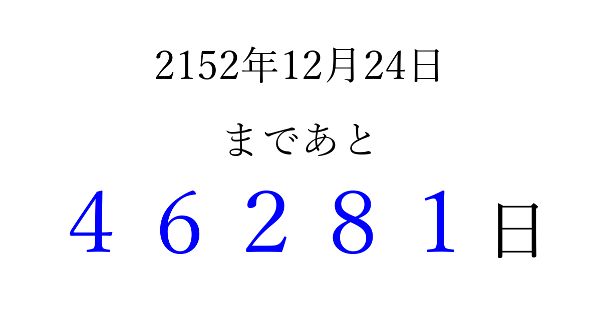 2152年12月24日(日)まで あと 99999 日です 追加すると、トップページからすぐ選べるようになります ※2026/04/08現在の結果です。 最新の状態に更新する ↓シェアして、タイムライン上にカウントダウンを表示しよう!↓ 📤 この結果を共有する Tweet シェア Threads Bluesky 別の日付でカウントダウン 2152年12月のカレンダー このページをブックマークに追加すると、いつでもカウントダウンを確認できます。 (PC: Ctrl+D / Mac: ⌘+D) hitome-notes.comでは以下のページも運営しています。 指定日と期間から日付を計算 | ガチャ確率計算・シミュレーション | プライバシー・ポリシー 運営者:Avocado