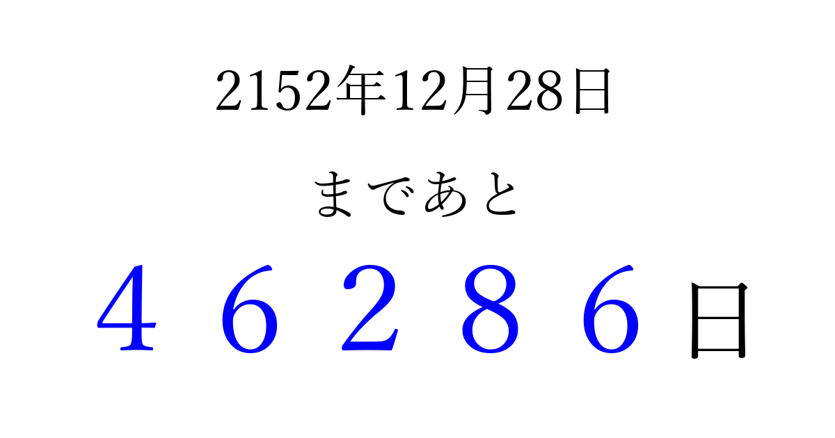 2152年12月28日(木)まで あと 99999 日です 追加すると、トップページからすぐ選べるようになります ※2026/04/07現在の結果です。 最新の状態に更新する ↓シェアして、タイムライン上にカウントダウンを表示しよう!↓ 📤 この結果を共有する Tweet シェア Threads Bluesky 別の日付でカウントダウン 2152年12月のカレンダー このページをブックマークに追加すると、いつでもカウントダウンを確認できます。 (PC: Ctrl+D / Mac: ⌘+D) hitome-notes.comでは以下のページも運営しています。 指定日と期間から日付を計算 | ガチャ確率計算・シミュレーション | プライバシー・ポリシー 運営者:Avocado