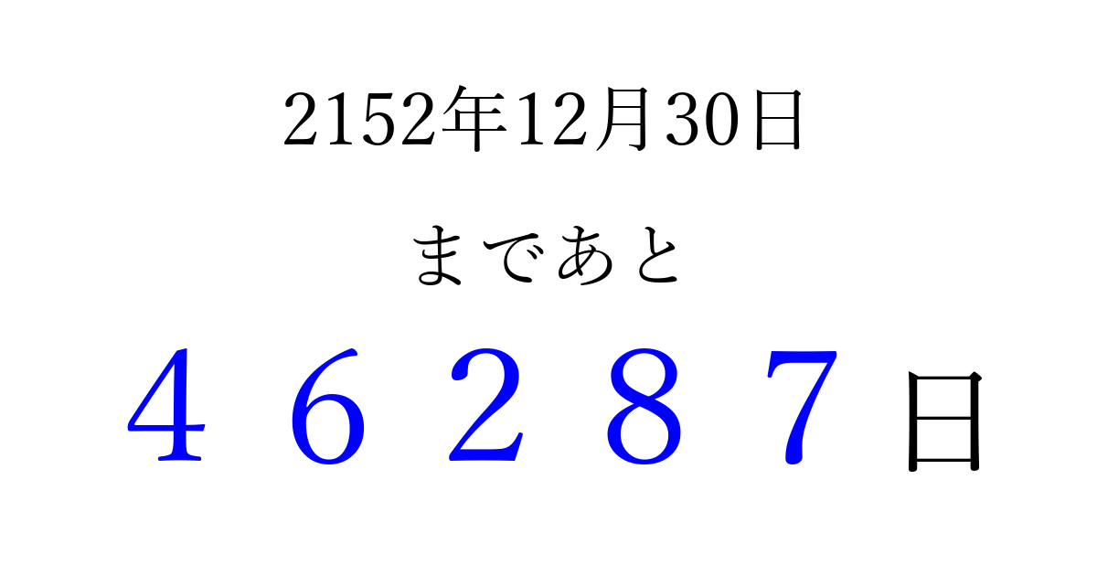 2152年12月30日(土)まで あと 99999 日です 追加すると、トップページからすぐ選べるようになります ※2026/04/08現在の結果です。 最新の状態に更新する ↓シェアして、タイムライン上にカウントダウンを表示しよう!↓ 📤 この結果を共有する Tweet シェア Threads Bluesky 別の日付でカウントダウン 2152年12月のカレンダー このページをブックマークに追加すると、いつでもカウントダウンを確認できます。 (PC: Ctrl+D / Mac: ⌘+D) hitome-notes.comでは以下のページも運営しています。 指定日と期間から日付を計算 | ガチャ確率計算・シミュレーション | プライバシー・ポリシー 運営者:Avocado