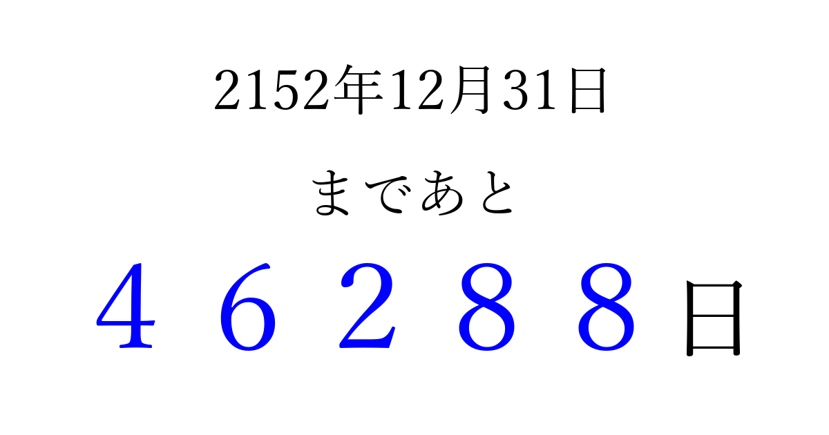 2152年12月31日(日)まで あと 99999 日です 追加すると、トップページからすぐ選べるようになります ※2026/04/08現在の結果です。 最新の状態に更新する ↓シェアして、タイムライン上にカウントダウンを表示しよう!↓ 📤 この結果を共有する Tweet シェア Threads Bluesky 別の日付でカウントダウン 2152年12月のカレンダー このページをブックマークに追加すると、いつでもカウントダウンを確認できます。 (PC: Ctrl+D / Mac: ⌘+D) hitome-notes.comでは以下のページも運営しています。 指定日と期間から日付を計算 | ガチャ確率計算・シミュレーション | プライバシー・ポリシー 運営者:Avocado