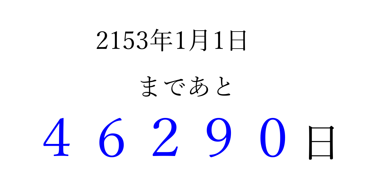 2153年1月1日(月)まで あと 99999 日です 追加すると、トップページからすぐ選べるようになります ※2026/04/07現在の結果です。 最新の状態に更新する ↓シェアして、タイムライン上にカウントダウンを表示しよう!↓ 📤 この結果を共有する Tweet シェア Threads Bluesky 別の日付でカウントダウン 2153年1月のカレンダー このページをブックマークに追加すると、いつでもカウントダウンを確認できます。 (PC: Ctrl+D / Mac: ⌘+D) hitome-notes.comでは以下のページも運営しています。 指定日と期間から日付を計算 | ガチャ確率計算・シミュレーション | プライバシー・ポリシー 運営者:Avocado