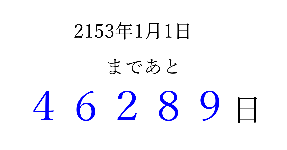 2153年1月1日(月)まで あと 99999 日です 追加すると、トップページからすぐ選べるようになります ※2026/04/08現在の結果です。 最新の状態に更新する ↓シェアして、タイムライン上にカウントダウンを表示しよう!↓ 📤 この結果を共有する Tweet シェア Threads Bluesky 別の日付でカウントダウン 2153年1月のカレンダー このページをブックマークに追加すると、いつでもカウントダウンを確認できます。 (PC: Ctrl+D / Mac: ⌘+D) hitome-notes.comでは以下のページも運営しています。 指定日と期間から日付を計算 | ガチャ確率計算・シミュレーション | プライバシー・ポリシー 運営者:Avocado