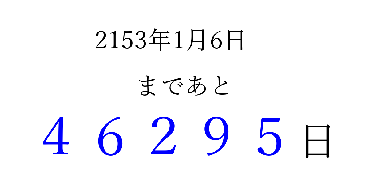 2153年1月6日(土)まで あと 99999 日です 追加すると、トップページからすぐ選べるようになります ※2026/04/07現在の結果です。 最新の状態に更新する ↓シェアして、タイムライン上にカウントダウンを表示しよう!↓ 📤 この結果を共有する Tweet シェア Threads Bluesky 別の日付でカウントダウン 2153年1月のカレンダー このページをブックマークに追加すると、いつでもカウントダウンを確認できます。 (PC: Ctrl+D / Mac: ⌘+D) hitome-notes.comでは以下のページも運営しています。 指定日と期間から日付を計算 | ガチャ確率計算・シミュレーション | プライバシー・ポリシー 運営者:Avocado