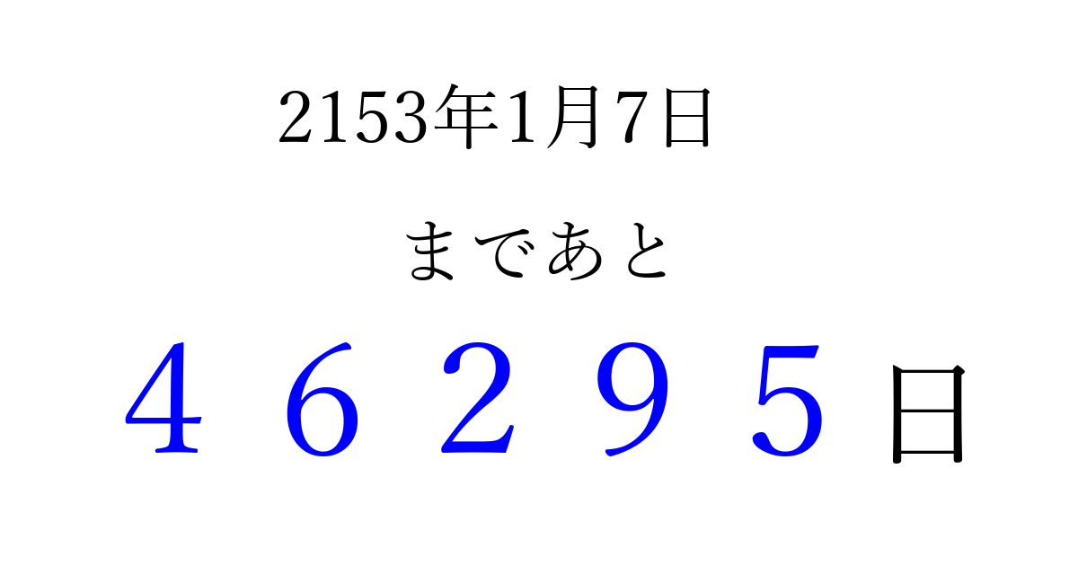2153年1月7日(日)まで あと 99999 日です 追加すると、トップページからすぐ選べるようになります ※2026/04/08現在の結果です。 最新の状態に更新する ↓シェアして、タイムライン上にカウントダウンを表示しよう!↓ 📤 この結果を共有する Tweet シェア Threads Bluesky 別の日付でカウントダウン 2153年1月のカレンダー このページをブックマークに追加すると、いつでもカウントダウンを確認できます。 (PC: Ctrl+D / Mac: ⌘+D) hitome-notes.comでは以下のページも運営しています。 指定日と期間から日付を計算 | ガチャ確率計算・シミュレーション | プライバシー・ポリシー 運営者:Avocado