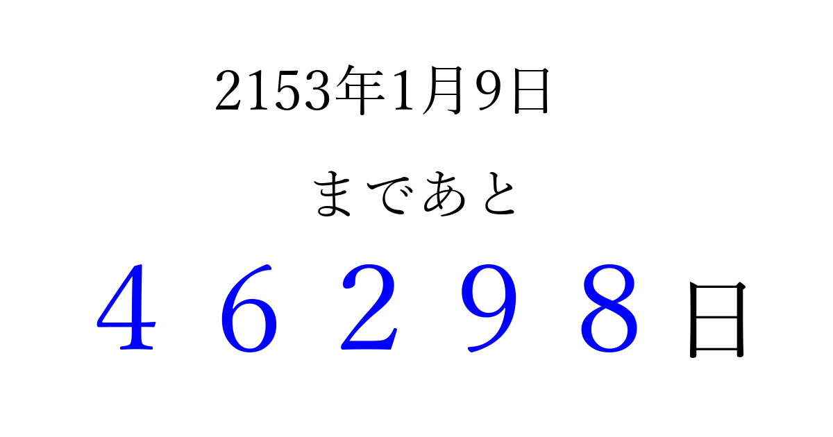 2153年1月9日(火)まで あと 99999 日です 追加すると、トップページからすぐ選べるようになります ※2026/04/07現在の結果です。 最新の状態に更新する ↓シェアして、タイムライン上にカウントダウンを表示しよう!↓ 📤 この結果を共有する Tweet シェア Threads Bluesky 別の日付でカウントダウン 2153年1月のカレンダー このページをブックマークに追加すると、いつでもカウントダウンを確認できます。 (PC: Ctrl+D / Mac: ⌘+D) hitome-notes.comでは以下のページも運営しています。 指定日と期間から日付を計算 | ガチャ確率計算・シミュレーション | プライバシー・ポリシー 運営者:Avocado