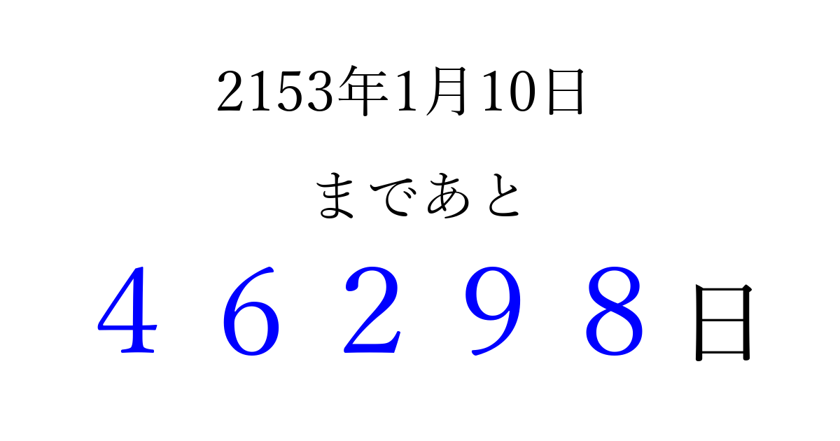 2153年1月10日(水)まで あと 99999 日です 追加すると、トップページからすぐ選べるようになります ※2026/04/08現在の結果です。 最新の状態に更新する ↓シェアして、タイムライン上にカウントダウンを表示しよう!↓ 📤 この結果を共有する Tweet シェア Threads Bluesky 別の日付でカウントダウン 2153年1月のカレンダー このページをブックマークに追加すると、いつでもカウントダウンを確認できます。 (PC: Ctrl+D / Mac: ⌘+D) hitome-notes.comでは以下のページも運営しています。 指定日と期間から日付を計算 | ガチャ確率計算・シミュレーション | プライバシー・ポリシー 運営者:Avocado