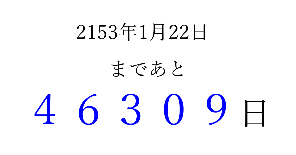 2153年1月22日(月)まで あと 99999 日です 追加すると、トップページからすぐ選べるようになります ※2026/04/09現在の結果です。 最新の状態に更新する ↓シェアして、タイムライン上にカウントダウンを表示しよう!↓ 📤 この結果を共有する Tweet シェア Threads Bluesky 別の日付でカウントダウン 2153年1月のカレンダー このページをブックマークに追加すると、いつでもカウントダウンを確認できます。 (PC: Ctrl+D / Mac: ⌘+D) hitome-notes.comでは以下のページも運営しています。 指定日と期間から日付を計算 | ガチャ確率計算・シミュレーション | プライバシー・ポリシー 運営者:Avocado