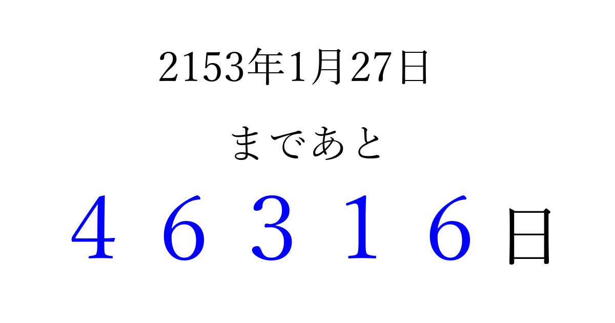 2153年1月27日(土)まで あと 99999 日です 追加すると、トップページからすぐ選べるようになります ※2026/04/07現在の結果です。 最新の状態に更新する ↓シェアして、タイムライン上にカウントダウンを表示しよう!↓ 📤 この結果を共有する Tweet シェア Threads Bluesky 別の日付でカウントダウン 2153年1月のカレンダー このページをブックマークに追加すると、いつでもカウントダウンを確認できます。 (PC: Ctrl+D / Mac: ⌘+D) hitome-notes.comでは以下のページも運営しています。 指定日と期間から日付を計算 | ガチャ確率計算・シミュレーション | プライバシー・ポリシー 運営者:Avocado