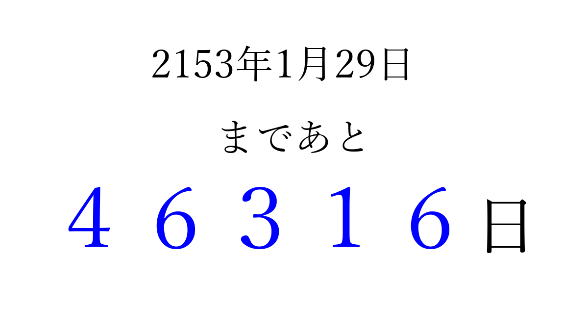 2153年1月29日(月)まで あと 99999 日です 追加すると、トップページからすぐ選べるようになります ※2026/04/09現在の結果です。 最新の状態に更新する ↓シェアして、タイムライン上にカウントダウンを表示しよう!↓ 📤 この結果を共有する Tweet シェア Threads Bluesky 別の日付でカウントダウン 2153年1月のカレンダー このページをブックマークに追加すると、いつでもカウントダウンを確認できます。 (PC: Ctrl+D / Mac: ⌘+D) hitome-notes.comでは以下のページも運営しています。 指定日と期間から日付を計算 | ガチャ確率計算・シミュレーション | プライバシー・ポリシー 運営者:Avocado