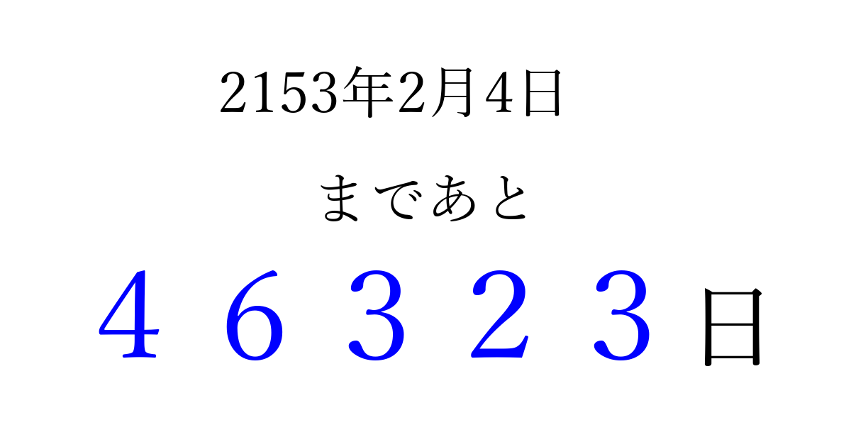 2153年2月4日(日)まで あと 99999 日です 追加すると、トップページからすぐ選べるようになります ※2026/04/08現在の結果です。 最新の状態に更新する ↓シェアして、タイムライン上にカウントダウンを表示しよう!↓ 📤 この結果を共有する Tweet シェア Threads Bluesky 別の日付でカウントダウン 2153年2月のカレンダー このページをブックマークに追加すると、いつでもカウントダウンを確認できます。 (PC: Ctrl+D / Mac: ⌘+D) hitome-notes.comでは以下のページも運営しています。 指定日と期間から日付を計算 | ガチャ確率計算・シミュレーション | プライバシー・ポリシー 運営者:Avocado