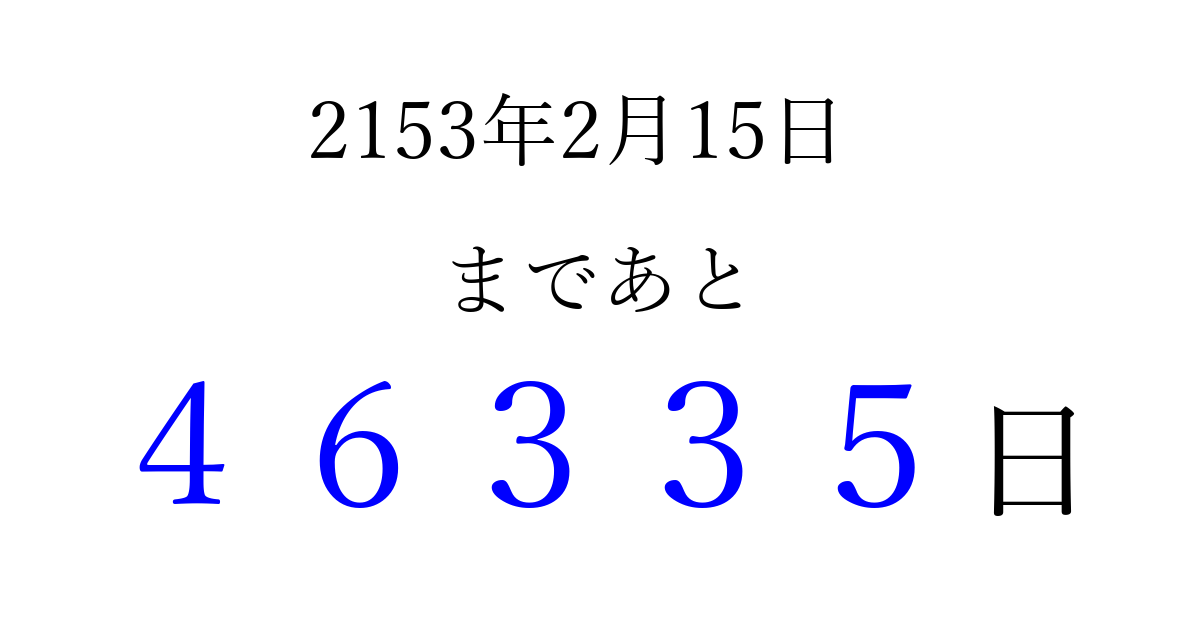 2153年2月15日(木)まで あと 99999 日です 追加すると、トップページからすぐ選べるようになります ※2026/04/07現在の結果です。 最新の状態に更新する ↓シェアして、タイムライン上にカウントダウンを表示しよう!↓ 📤 この結果を共有する Tweet シェア Threads Bluesky 別の日付でカウントダウン 2153年2月のカレンダー このページをブックマークに追加すると、いつでもカウントダウンを確認できます。 (PC: Ctrl+D / Mac: ⌘+D) hitome-notes.comでは以下のページも運営しています。 指定日と期間から日付を計算 | ガチャ確率計算・シミュレーション | プライバシー・ポリシー 運営者:Avocado