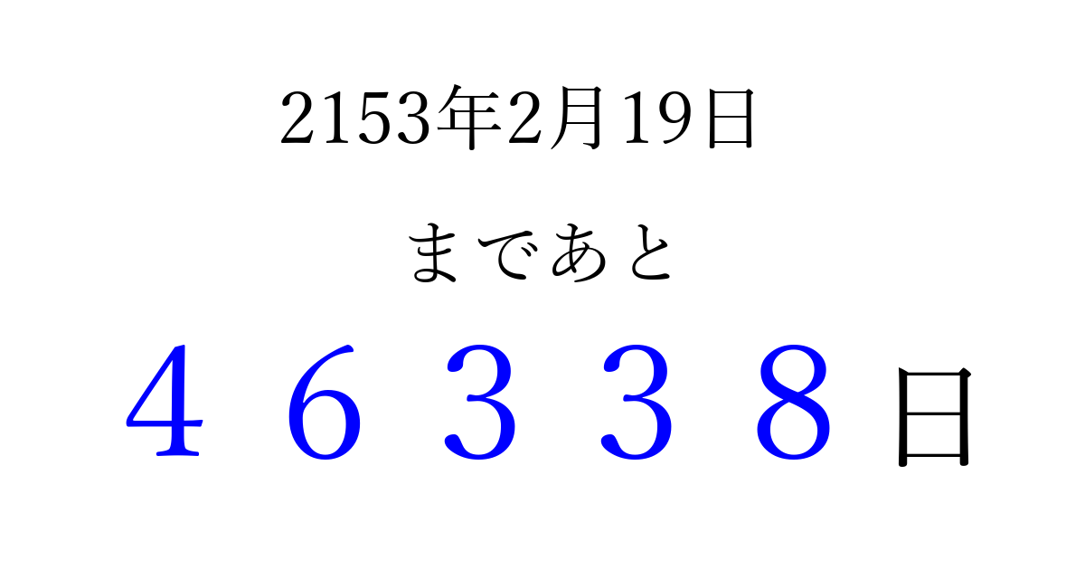 2153年2月19日(月)まで あと 99999 日です 追加すると、トップページからすぐ選べるようになります ※2026/04/08現在の結果です。 最新の状態に更新する ↓シェアして、タイムライン上にカウントダウンを表示しよう!↓ 📤 この結果を共有する Tweet シェア Threads Bluesky 別の日付でカウントダウン 2153年2月のカレンダー このページをブックマークに追加すると、いつでもカウントダウンを確認できます。 (PC: Ctrl+D / Mac: ⌘+D) hitome-notes.comでは以下のページも運営しています。 指定日と期間から日付を計算 | ガチャ確率計算・シミュレーション | プライバシー・ポリシー 運営者:Avocado