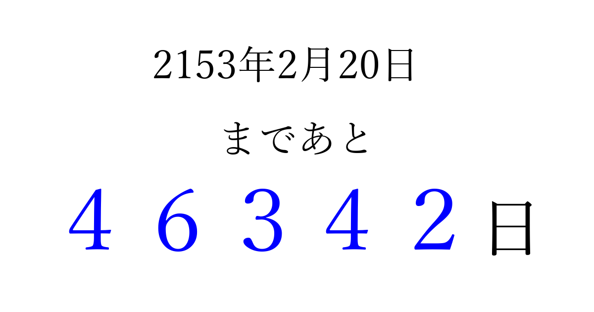 2153年2月20日(火)まで あと 99999 日です 追加すると、トップページからすぐ選べるようになります ※2026/04/05現在の結果です。 最新の状態に更新する ↓シェアして、タイムライン上にカウントダウンを表示しよう!↓ 📤 この結果を共有する Tweet シェア Threads Bluesky 別の日付でカウントダウン 2153年2月のカレンダー このページをブックマークに追加すると、いつでもカウントダウンを確認できます。 (PC: Ctrl+D / Mac: ⌘+D) hitome-notes.comでは以下のページも運営しています。 指定日と期間から日付を計算 | ガチャ確率計算・シミュレーション | プライバシー・ポリシー 運営者:Avocado