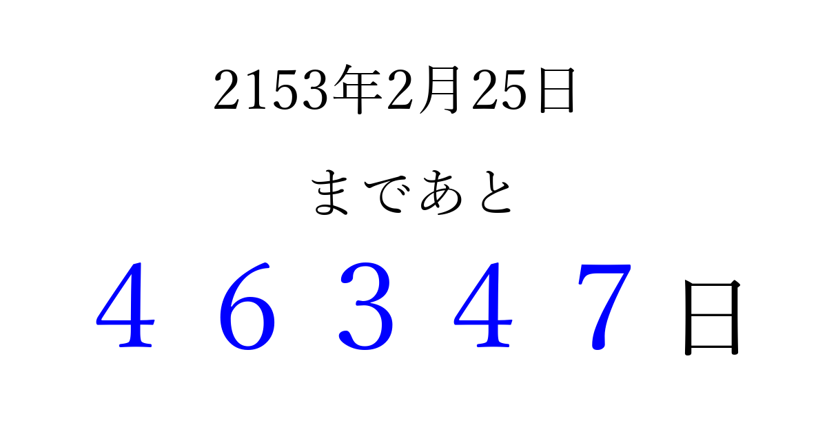 2153年2月25日(日)まで あと 99999 日です 追加すると、トップページからすぐ選べるようになります ※2026/04/05現在の結果です。 最新の状態に更新する ↓シェアして、タイムライン上にカウントダウンを表示しよう!↓ 📤 この結果を共有する Tweet シェア Threads Bluesky 別の日付でカウントダウン 2153年2月のカレンダー このページをブックマークに追加すると、いつでもカウントダウンを確認できます。 (PC: Ctrl+D / Mac: ⌘+D) hitome-notes.comでは以下のページも運営しています。 指定日と期間から日付を計算 | ガチャ確率計算・シミュレーション | プライバシー・ポリシー 運営者:Avocado
