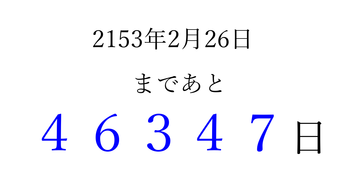 2153年2月26日(月)まで あと 99999 日です 追加すると、トップページからすぐ選べるようになります ※2026/04/06現在の結果です。 最新の状態に更新する ↓シェアして、タイムライン上にカウントダウンを表示しよう!↓ 📤 この結果を共有する Tweet シェア Threads Bluesky 別の日付でカウントダウン 2153年2月のカレンダー このページをブックマークに追加すると、いつでもカウントダウンを確認できます。 (PC: Ctrl+D / Mac: ⌘+D) hitome-notes.comでは以下のページも運営しています。 指定日と期間から日付を計算 | ガチャ確率計算・シミュレーション | プライバシー・ポリシー 運営者:Avocado