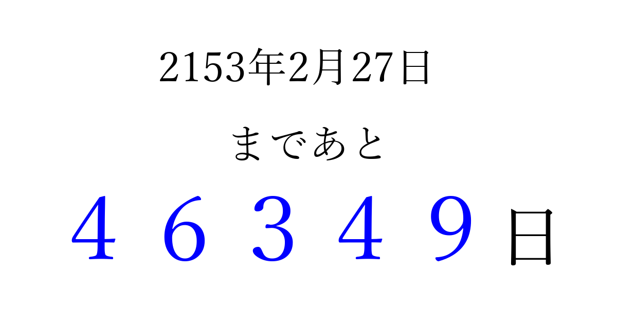 2153年2月27日(火)まで あと 99999 日です 追加すると、トップページからすぐ選べるようになります ※2026/04/05現在の結果です。 最新の状態に更新する ↓シェアして、タイムライン上にカウントダウンを表示しよう!↓ 📤 この結果を共有する Tweet シェア Threads Bluesky 別の日付でカウントダウン 2153年2月のカレンダー このページをブックマークに追加すると、いつでもカウントダウンを確認できます。 (PC: Ctrl+D / Mac: ⌘+D) hitome-notes.comでは以下のページも運営しています。 指定日と期間から日付を計算 | ガチャ確率計算・シミュレーション | プライバシー・ポリシー 運営者:Avocado
