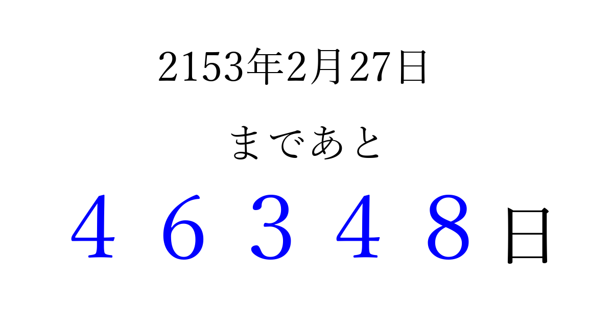 2153年2月27日(火)まで あと 99999 日です 追加すると、トップページからすぐ選べるようになります ※2026/04/06現在の結果です。 最新の状態に更新する ↓シェアして、タイムライン上にカウントダウンを表示しよう!↓ 📤 この結果を共有する Tweet シェア Threads Bluesky 別の日付でカウントダウン 2153年2月のカレンダー このページをブックマークに追加すると、いつでもカウントダウンを確認できます。 (PC: Ctrl+D / Mac: ⌘+D) hitome-notes.comでは以下のページも運営しています。 指定日と期間から日付を計算 | ガチャ確率計算・シミュレーション | プライバシー・ポリシー 運営者:Avocado