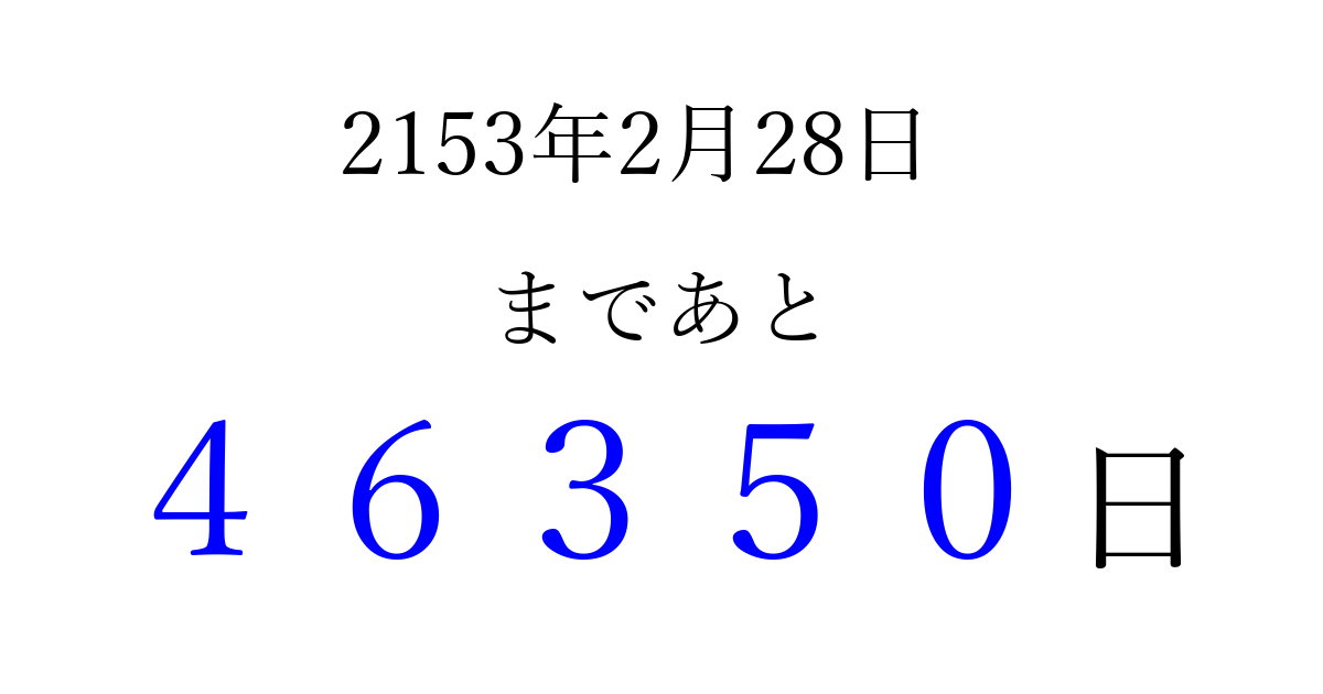 2153年2月28日(水)まで あと 99999 日です 追加すると、トップページからすぐ選べるようになります ※2026/04/05現在の結果です。 最新の状態に更新する ↓シェアして、タイムライン上にカウントダウンを表示しよう!↓ 📤 この結果を共有する Tweet シェア Threads Bluesky 別の日付でカウントダウン 2153年2月のカレンダー このページをブックマークに追加すると、いつでもカウントダウンを確認できます。 (PC: Ctrl+D / Mac: ⌘+D) hitome-notes.comでは以下のページも運営しています。 指定日と期間から日付を計算 | ガチャ確率計算・シミュレーション | プライバシー・ポリシー 運営者:Avocado