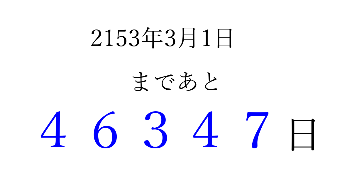 2153年3月1日(木)まで あと 99999 日です 追加すると、トップページからすぐ選べるようになります ※2026/04/09現在の結果です。 最新の状態に更新する ↓シェアして、タイムライン上にカウントダウンを表示しよう!↓ 📤 この結果を共有する Tweet シェア Threads Bluesky 別の日付でカウントダウン 2153年3月のカレンダー このページをブックマークに追加すると、いつでもカウントダウンを確認できます。 (PC: Ctrl+D / Mac: ⌘+D) hitome-notes.comでは以下のページも運営しています。 指定日と期間から日付を計算 | ガチャ確率計算・シミュレーション | プライバシー・ポリシー 運営者:Avocado