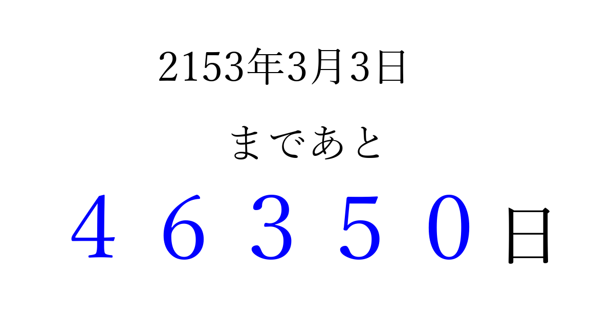 2153年3月3日(土)まで あと 99999 日です 追加すると、トップページからすぐ選べるようになります ※2026/04/08現在の結果です。 最新の状態に更新する ↓シェアして、タイムライン上にカウントダウンを表示しよう!↓ 📤 この結果を共有する Tweet シェア Threads Bluesky 別の日付でカウントダウン 2153年3月のカレンダー このページをブックマークに追加すると、いつでもカウントダウンを確認できます。 (PC: Ctrl+D / Mac: ⌘+D) hitome-notes.comでは以下のページも運営しています。 指定日と期間から日付を計算 | ガチャ確率計算・シミュレーション | プライバシー・ポリシー 運営者:Avocado