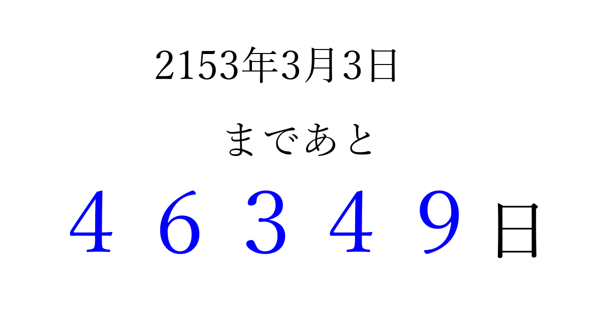 2153年3月3日(土)まで あと 99999 日です 追加すると、トップページからすぐ選べるようになります ※2026/04/09現在の結果です。 最新の状態に更新する ↓シェアして、タイムライン上にカウントダウンを表示しよう!↓ 📤 この結果を共有する Tweet シェア Threads Bluesky 別の日付でカウントダウン 2153年3月のカレンダー このページをブックマークに追加すると、いつでもカウントダウンを確認できます。 (PC: Ctrl+D / Mac: ⌘+D) hitome-notes.comでは以下のページも運営しています。 指定日と期間から日付を計算 | ガチャ確率計算・シミュレーション | プライバシー・ポリシー 運営者:Avocado