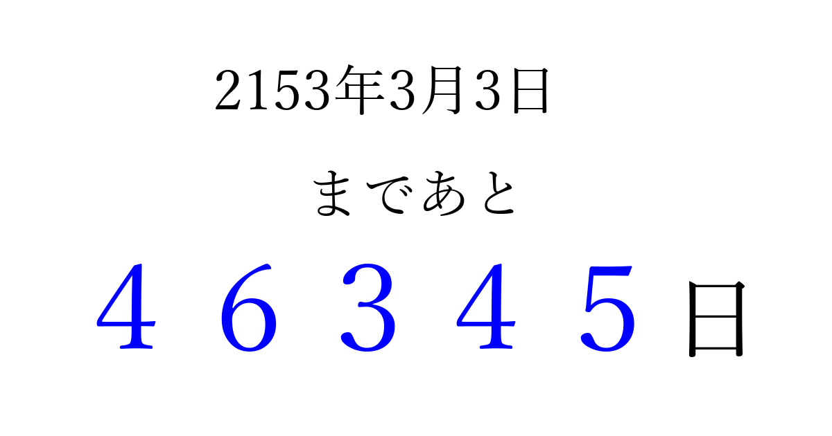 2153年3月3日(土)まで あと 99999 日です 追加すると、トップページからすぐ選べるようになります ※2026/04/13現在の結果です。 最新の状態に更新する ↓シェアして、タイムライン上にカウントダウンを表示しよう!↓ 📤 この結果を共有する Tweet シェア Threads Bluesky 別の日付でカウントダウン 2153年3月のカレンダー このページをブックマークに追加すると、いつでもカウントダウンを確認できます。 (PC: Ctrl+D / Mac: ⌘+D) hitome-notes.comでは以下のページも運営しています。 指定日と期間から日付を計算 | ガチャ確率計算・シミュレーション | プライバシー・ポリシー 運営者:Avocado