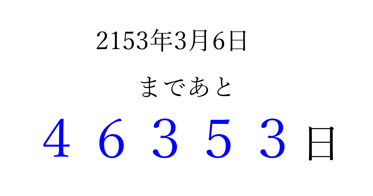 2153年3月6日(火)まで あと 99999 日です 追加すると、トップページからすぐ選べるようになります ※2026/04/08現在の結果です。 最新の状態に更新する ↓シェアして、タイムライン上にカウントダウンを表示しよう!↓ 📤 この結果を共有する Tweet シェア Threads Bluesky 別の日付でカウントダウン 2153年3月のカレンダー このページをブックマークに追加すると、いつでもカウントダウンを確認できます。 (PC: Ctrl+D / Mac: ⌘+D) hitome-notes.comでは以下のページも運営しています。 指定日と期間から日付を計算 | ガチャ確率計算・シミュレーション | プライバシー・ポリシー 運営者:Avocado