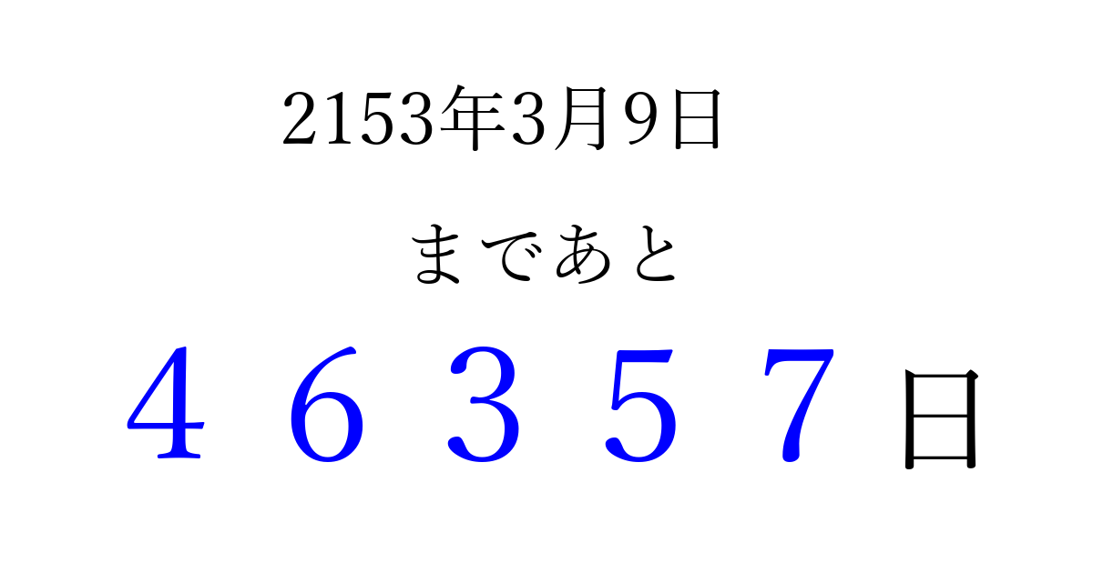 2153年3月9日(金)まで あと 99999 日です 追加すると、トップページからすぐ選べるようになります ※2026/04/07現在の結果です。 最新の状態に更新する ↓シェアして、タイムライン上にカウントダウンを表示しよう!↓ 📤 この結果を共有する Tweet シェア Threads Bluesky 別の日付でカウントダウン 2153年3月のカレンダー このページをブックマークに追加すると、いつでもカウントダウンを確認できます。 (PC: Ctrl+D / Mac: ⌘+D) hitome-notes.comでは以下のページも運営しています。 指定日と期間から日付を計算 | ガチャ確率計算・シミュレーション | プライバシー・ポリシー 運営者:Avocado