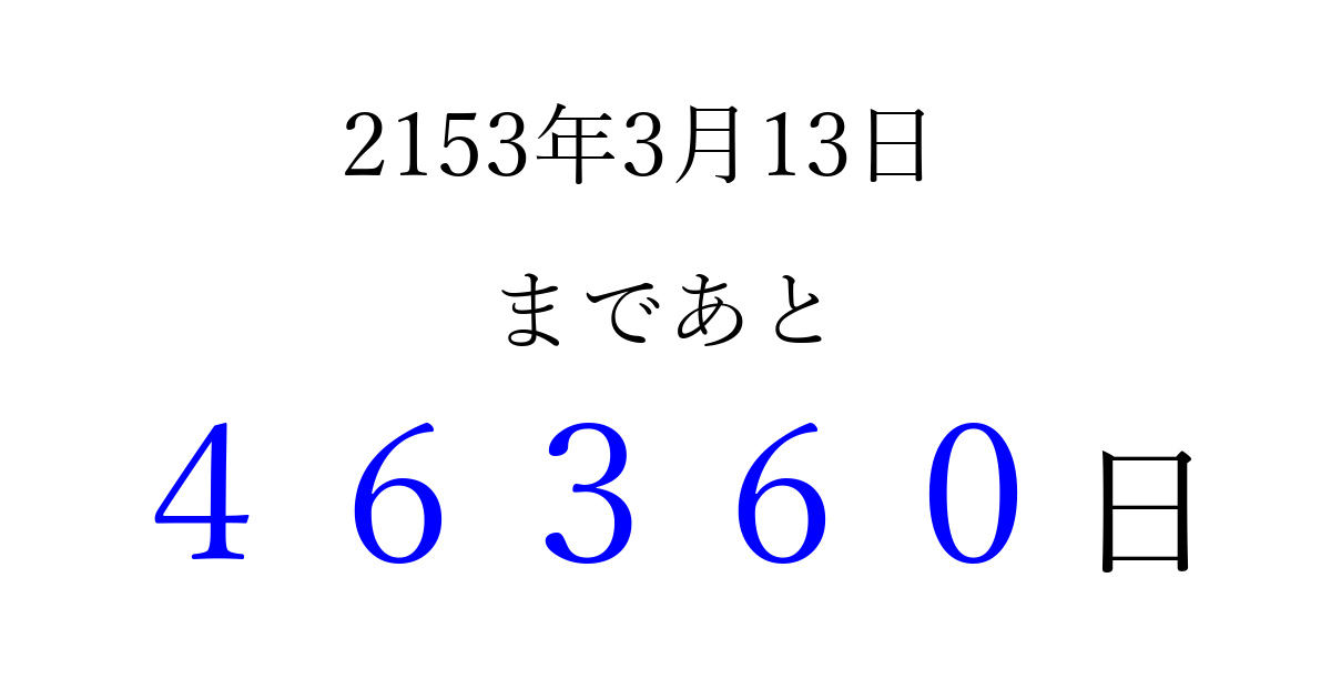 2153年3月13日(火)まで あと 99999 日です 追加すると、トップページからすぐ選べるようになります ※2026/04/08現在の結果です。 最新の状態に更新する ↓シェアして、タイムライン上にカウントダウンを表示しよう!↓ 📤 この結果を共有する Tweet シェア Threads Bluesky 別の日付でカウントダウン 2153年3月のカレンダー このページをブックマークに追加すると、いつでもカウントダウンを確認できます。 (PC: Ctrl+D / Mac: ⌘+D) hitome-notes.comでは以下のページも運営しています。 指定日と期間から日付を計算 | ガチャ確率計算・シミュレーション | プライバシー・ポリシー 運営者:Avocado