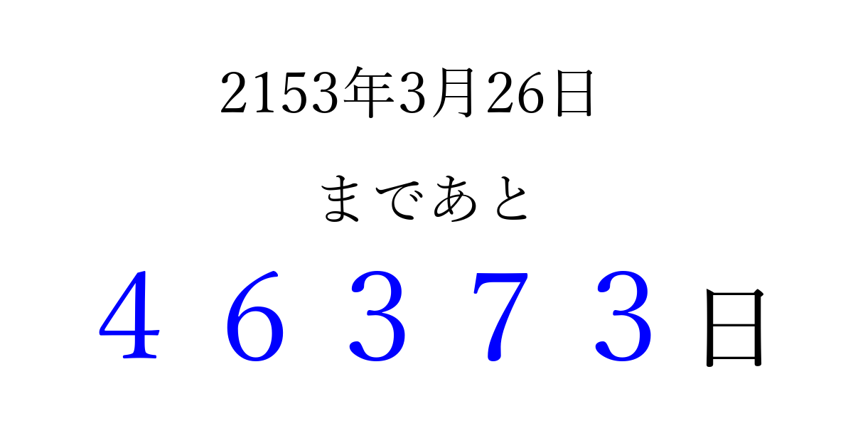 2153年3月26日(月)まで あと 99999 日です 追加すると、トップページからすぐ選べるようになります ※2026/04/08現在の結果です。 最新の状態に更新する ↓シェアして、タイムライン上にカウントダウンを表示しよう!↓ 📤 この結果を共有する Tweet シェア Threads Bluesky 別の日付でカウントダウン 2153年3月のカレンダー このページをブックマークに追加すると、いつでもカウントダウンを確認できます。 (PC: Ctrl+D / Mac: ⌘+D) hitome-notes.comでは以下のページも運営しています。 指定日と期間から日付を計算 | ガチャ確率計算・シミュレーション | プライバシー・ポリシー 運営者:Avocado