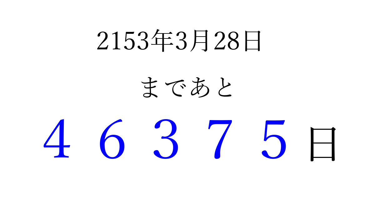 2153年3月28日(水)まで あと 99999 日です 追加すると、トップページからすぐ選べるようになります ※2026/04/08現在の結果です。 最新の状態に更新する ↓シェアして、タイムライン上にカウントダウンを表示しよう!↓ 📤 この結果を共有する Tweet シェア Threads Bluesky 別の日付でカウントダウン 2153年3月のカレンダー このページをブックマークに追加すると、いつでもカウントダウンを確認できます。 (PC: Ctrl+D / Mac: ⌘+D) hitome-notes.comでは以下のページも運営しています。 指定日と期間から日付を計算 | ガチャ確率計算・シミュレーション | プライバシー・ポリシー 運営者:Avocado