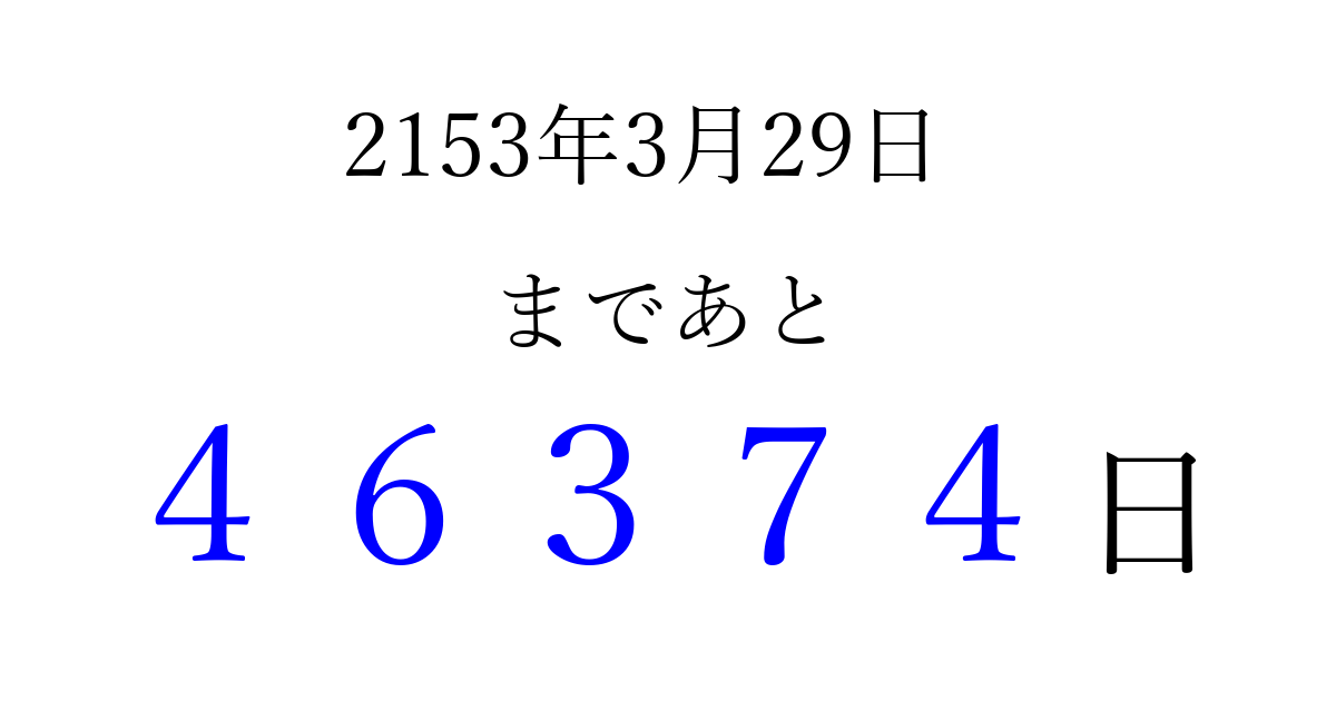 2153年3月29日(木)まで あと 99999 日です 追加すると、トップページからすぐ選べるようになります ※2026/04/10現在の結果です。 最新の状態に更新する ↓シェアして、タイムライン上にカウントダウンを表示しよう!↓ 📤 この結果を共有する Tweet シェア Threads Bluesky 別の日付でカウントダウン 2153年3月のカレンダー このページをブックマークに追加すると、いつでもカウントダウンを確認できます。 (PC: Ctrl+D / Mac: ⌘+D) hitome-notes.comでは以下のページも運営しています。 指定日と期間から日付を計算 | ガチャ確率計算・シミュレーション | プライバシー・ポリシー 運営者:Avocado