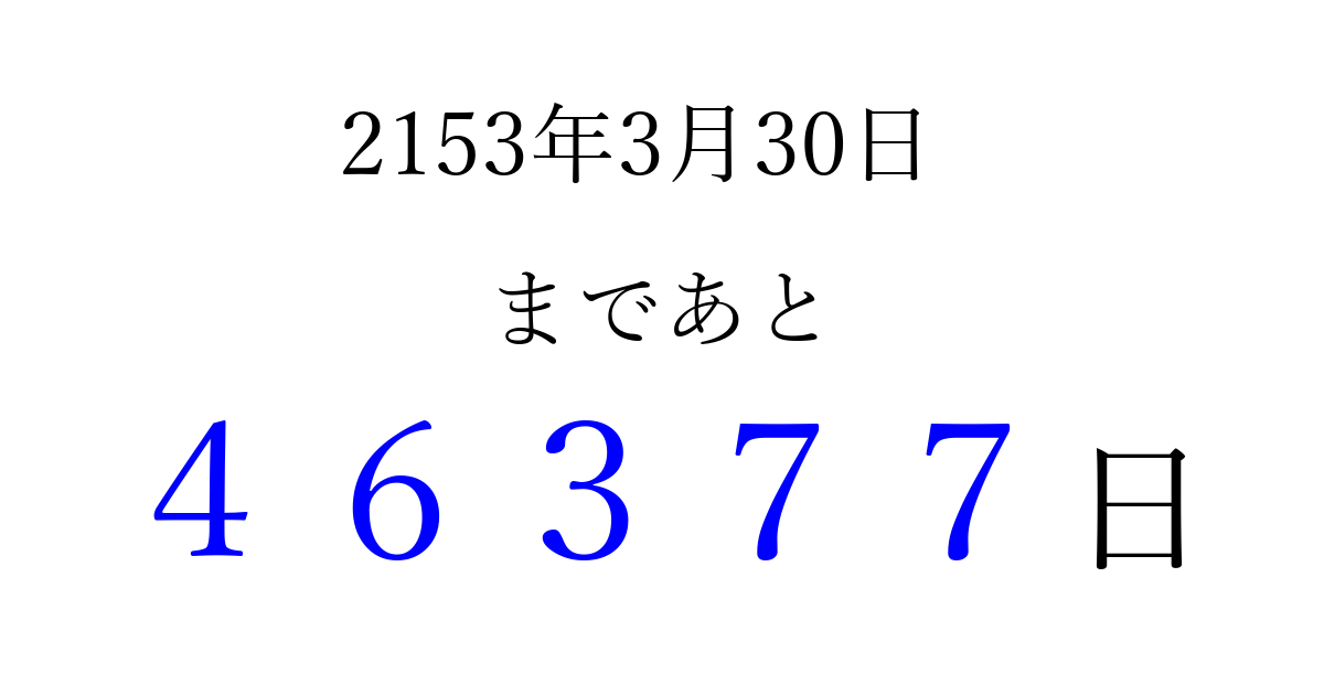 2153年3月30日(金)まで あと 99999 日です 追加すると、トップページからすぐ選べるようになります ※2026/04/08現在の結果です。 最新の状態に更新する ↓シェアして、タイムライン上にカウントダウンを表示しよう!↓ 📤 この結果を共有する Tweet シェア Threads Bluesky 別の日付でカウントダウン 2153年3月のカレンダー このページをブックマークに追加すると、いつでもカウントダウンを確認できます。 (PC: Ctrl+D / Mac: ⌘+D) hitome-notes.comでは以下のページも運営しています。 指定日と期間から日付を計算 | ガチャ確率計算・シミュレーション | プライバシー・ポリシー 運営者:Avocado