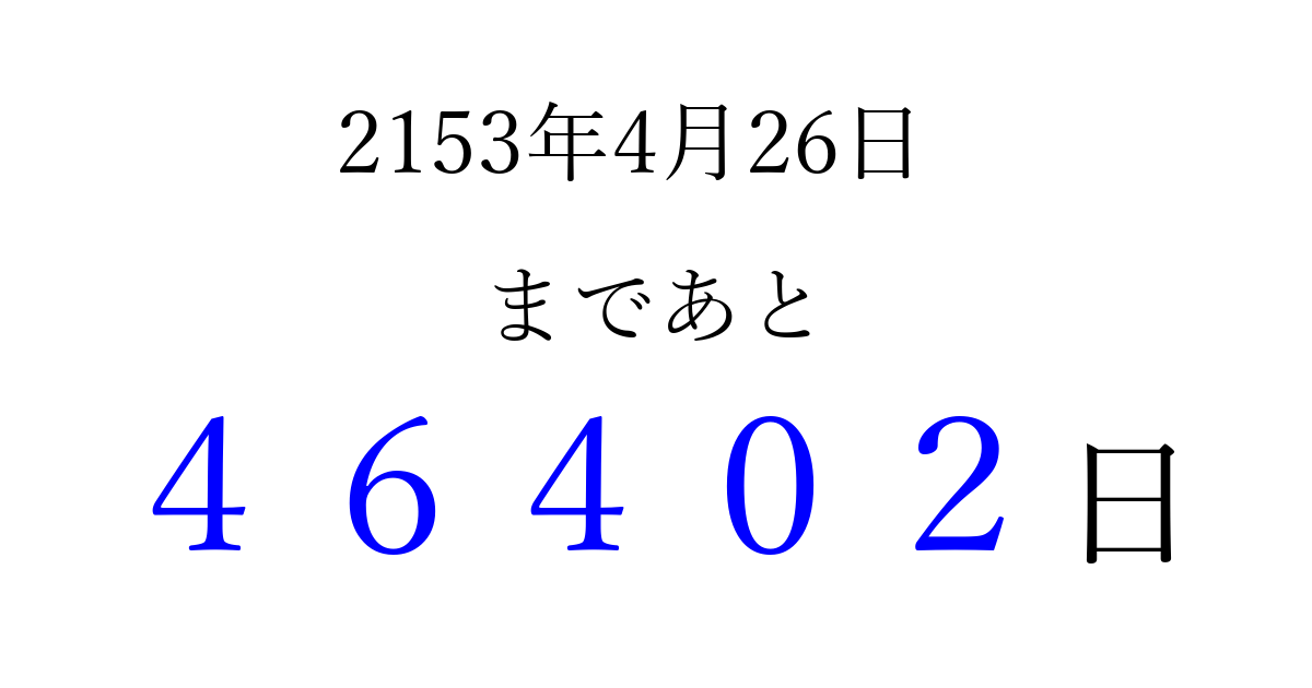 2153年4月26日(木)まで あと 99999 日です 追加すると、トップページからすぐ選べるようになります ※2026/04/10現在の結果です。 最新の状態に更新する ↓シェアして、タイムライン上にカウントダウンを表示しよう!↓ 📤 この結果を共有する Tweet シェア Threads Bluesky 別の日付でカウントダウン 2153年4月のカレンダー このページをブックマークに追加すると、いつでもカウントダウンを確認できます。 (PC: Ctrl+D / Mac: ⌘+D) hitome-notes.comでは以下のページも運営しています。 指定日と期間から日付を計算 | ガチャ確率計算・シミュレーション | プライバシー・ポリシー 運営者:Avocado