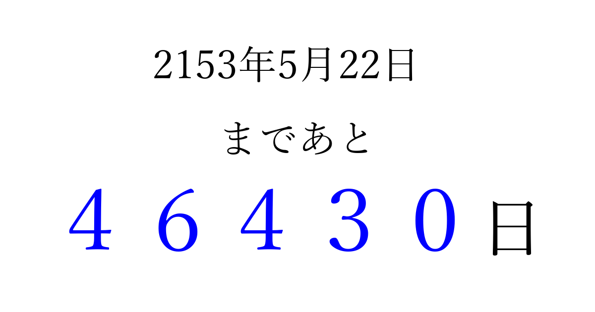 2153年5月22日(火)まで あと 99999 日です 追加すると、トップページからすぐ選べるようになります ※2026/04/08現在の結果です。 最新の状態に更新する ↓シェアして、タイムライン上にカウントダウンを表示しよう!↓ 📤 この結果を共有する Tweet シェア Threads Bluesky 別の日付でカウントダウン 2153年5月のカレンダー このページをブックマークに追加すると、いつでもカウントダウンを確認できます。 (PC: Ctrl+D / Mac: ⌘+D) hitome-notes.comでは以下のページも運営しています。 指定日と期間から日付を計算 | ガチャ確率計算・シミュレーション | プライバシー・ポリシー 運営者:Avocado
