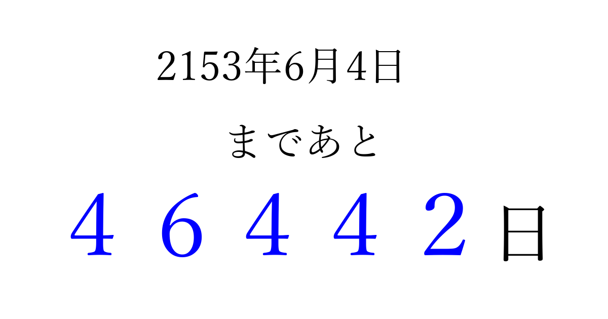 2153年6月4日(月)まで あと 99999 日です 追加すると、トップページからすぐ選べるようになります ※2026/04/09現在の結果です。 最新の状態に更新する ↓シェアして、タイムライン上にカウントダウンを表示しよう!↓ 📤 この結果を共有する Tweet シェア Threads Bluesky 別の日付でカウントダウン 2153年6月のカレンダー このページをブックマークに追加すると、いつでもカウントダウンを確認できます。 (PC: Ctrl+D / Mac: ⌘+D) hitome-notes.comでは以下のページも運営しています。 指定日と期間から日付を計算 | ガチャ確率計算・シミュレーション | プライバシー・ポリシー 運営者:Avocado