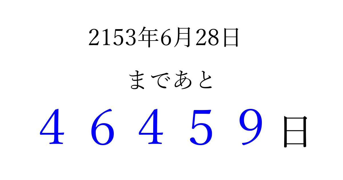 2153年6月28日(木)まで あと 99999 日です 追加すると、トップページからすぐ選べるようになります ※2026/04/16現在の結果です。 最新の状態に更新する ↓シェアして、タイムライン上にカウントダウンを表示しよう!↓ 📤 この結果を共有する Tweet シェア Threads Bluesky 別の日付でカウントダウン 2153年6月のカレンダー このページをブックマークに追加すると、いつでもカウントダウンを確認できます。 (PC: Ctrl+D / Mac: ⌘+D) hitome-notes.comでは以下のページも運営しています。 指定日と期間から日付を計算 | ガチャ確率計算・シミュレーション | プライバシー・ポリシー 運営者:Avocado