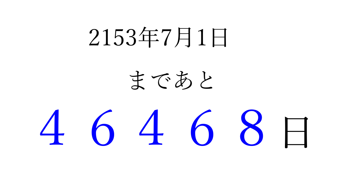 2153年7月1日(日)まで あと 99999 日です 追加すると、トップページからすぐ選べるようになります ※2026/04/10現在の結果です。 最新の状態に更新する ↓シェアして、タイムライン上にカウントダウンを表示しよう!↓ 📤 この結果を共有する Tweet シェア Threads Bluesky 別の日付でカウントダウン 2153年7月のカレンダー このページをブックマークに追加すると、いつでもカウントダウンを確認できます。 (PC: Ctrl+D / Mac: ⌘+D) hitome-notes.comでは以下のページも運営しています。 指定日と期間から日付を計算 | ガチャ確率計算・シミュレーション | プライバシー・ポリシー 運営者:Avocado