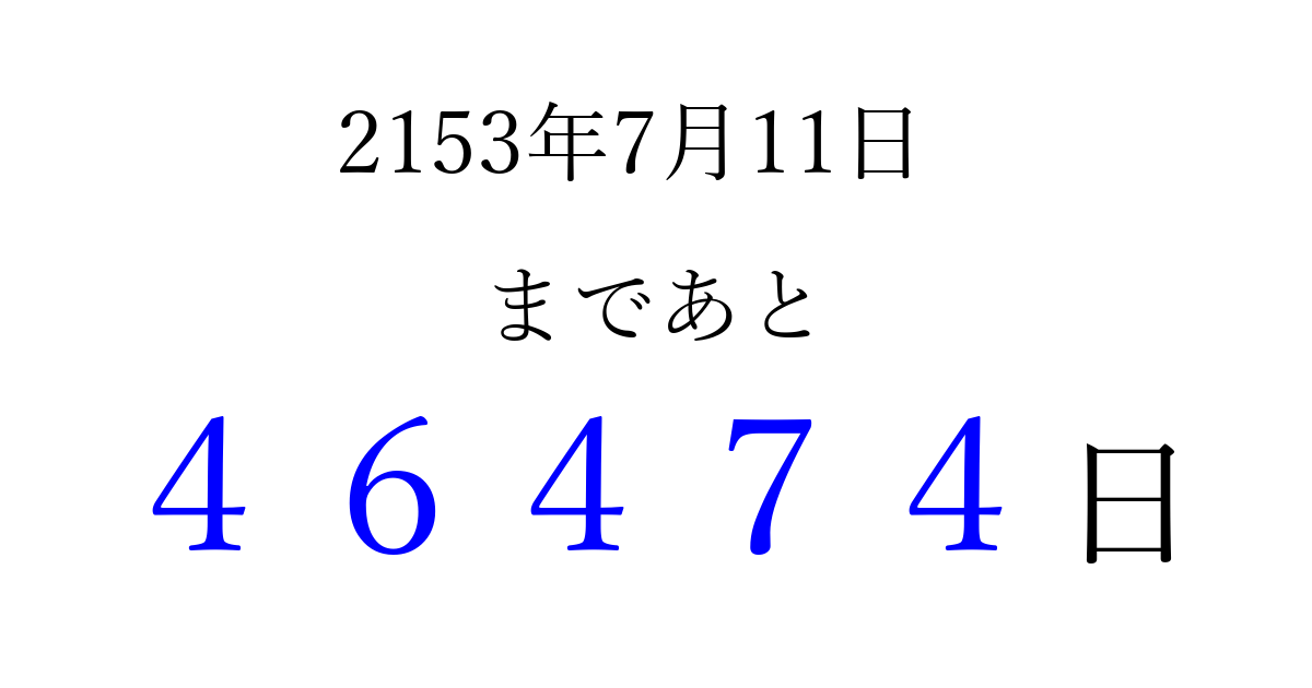 2153年7月11日(水)まで あと 99999 日です 追加すると、トップページからすぐ選べるようになります ※2026/04/14現在の結果です。 最新の状態に更新する ↓シェアして、タイムライン上にカウントダウンを表示しよう!↓ 📤 この結果を共有する Tweet シェア Threads Bluesky 別の日付でカウントダウン 2153年7月のカレンダー このページをブックマークに追加すると、いつでもカウントダウンを確認できます。 (PC: Ctrl+D / Mac: ⌘+D) hitome-notes.comでは以下のページも運営しています。 指定日と期間から日付を計算 | ガチャ確率計算・シミュレーション | プライバシー・ポリシー 運営者:Avocado