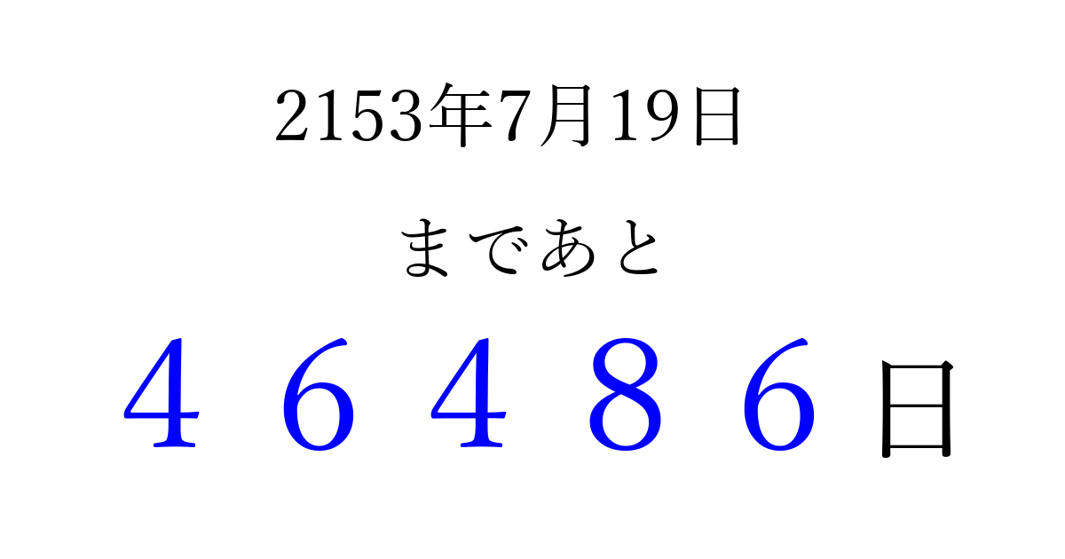 2153年7月19日(木)まで あと 99999 日です 追加すると、トップページからすぐ選べるようになります ※2026/04/10現在の結果です。 最新の状態に更新する ↓シェアして、タイムライン上にカウントダウンを表示しよう!↓ 📤 この結果を共有する Tweet シェア Threads Bluesky 別の日付でカウントダウン 2153年7月のカレンダー このページをブックマークに追加すると、いつでもカウントダウンを確認できます。 (PC: Ctrl+D / Mac: ⌘+D) hitome-notes.comでは以下のページも運営しています。 指定日と期間から日付を計算 | ガチャ確率計算・シミュレーション | プライバシー・ポリシー 運営者:Avocado