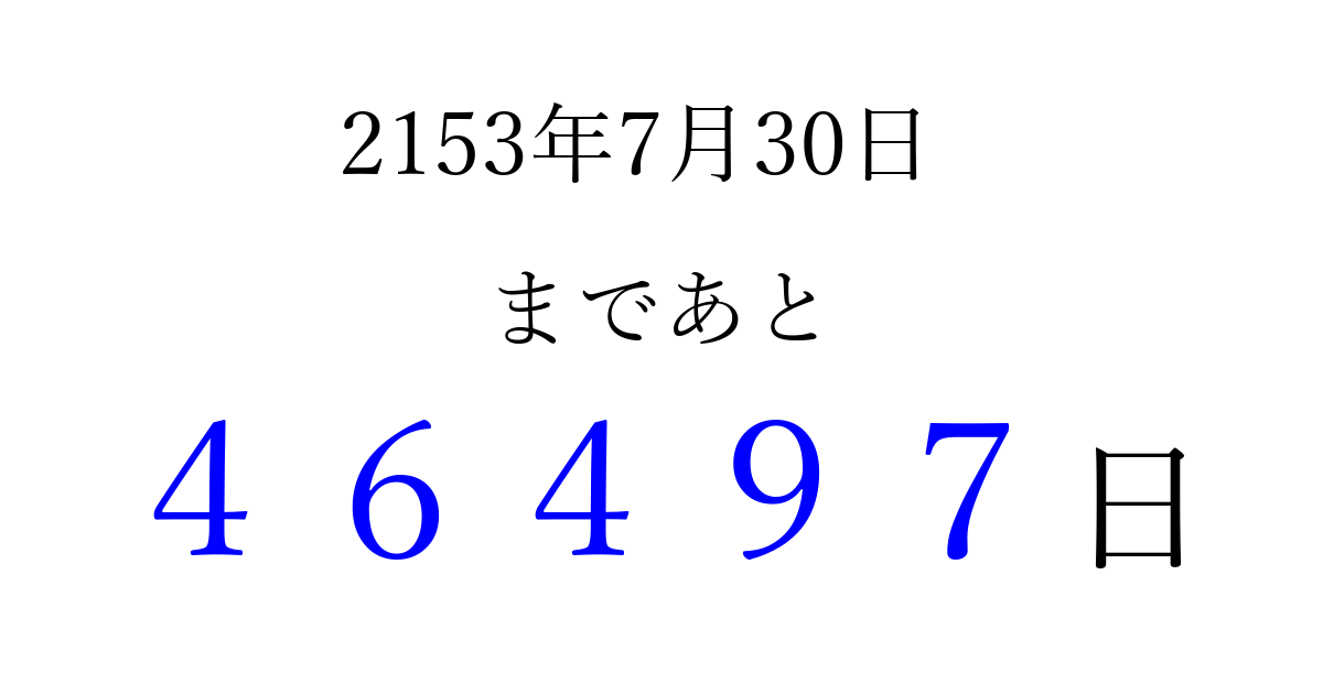 2153年7月30日(月)まで あと 99999 日です 追加すると、トップページからすぐ選べるようになります ※2026/04/10現在の結果です。 最新の状態に更新する ↓シェアして、タイムライン上にカウントダウンを表示しよう!↓ 📤 この結果を共有する Tweet シェア Threads Bluesky 別の日付でカウントダウン 2153年7月のカレンダー このページをブックマークに追加すると、いつでもカウントダウンを確認できます。 (PC: Ctrl+D / Mac: ⌘+D) hitome-notes.comでは以下のページも運営しています。 指定日と期間から日付を計算 | ガチャ確率計算・シミュレーション | プライバシー・ポリシー 運営者:Avocado
