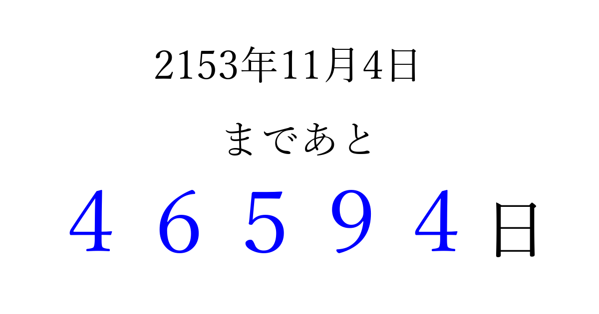 2153年11月4日(日)まで あと 99999 日です 追加すると、トップページからすぐ選べるようになります ※2026/04/10現在の結果です。 最新の状態に更新する ↓シェアして、タイムライン上にカウントダウンを表示しよう!↓ 📤 この結果を共有する Tweet シェア Threads Bluesky 別の日付でカウントダウン 2153年11月のカレンダー このページをブックマークに追加すると、いつでもカウントダウンを確認できます。 (PC: Ctrl+D / Mac: ⌘+D) hitome-notes.comでは以下のページも運営しています。 指定日と期間から日付を計算 | ガチャ確率計算・シミュレーション | プライバシー・ポリシー 運営者:Avocado