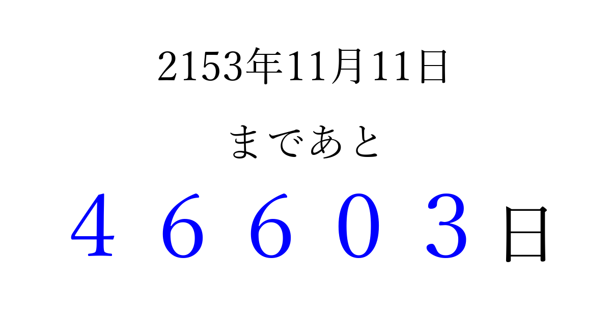 2153年11月11日(日)まで あと 99999 日です 追加すると、トップページからすぐ選べるようになります ※2026/04/08現在の結果です。 最新の状態に更新する ↓シェアして、タイムライン上にカウントダウンを表示しよう!↓ 📤 この結果を共有する Tweet シェア Threads Bluesky 別の日付でカウントダウン 2153年11月のカレンダー このページをブックマークに追加すると、いつでもカウントダウンを確認できます。 (PC: Ctrl+D / Mac: ⌘+D) hitome-notes.comでは以下のページも運営しています。 指定日と期間から日付を計算 | ガチャ確率計算・シミュレーション | プライバシー・ポリシー 運営者:Avocado