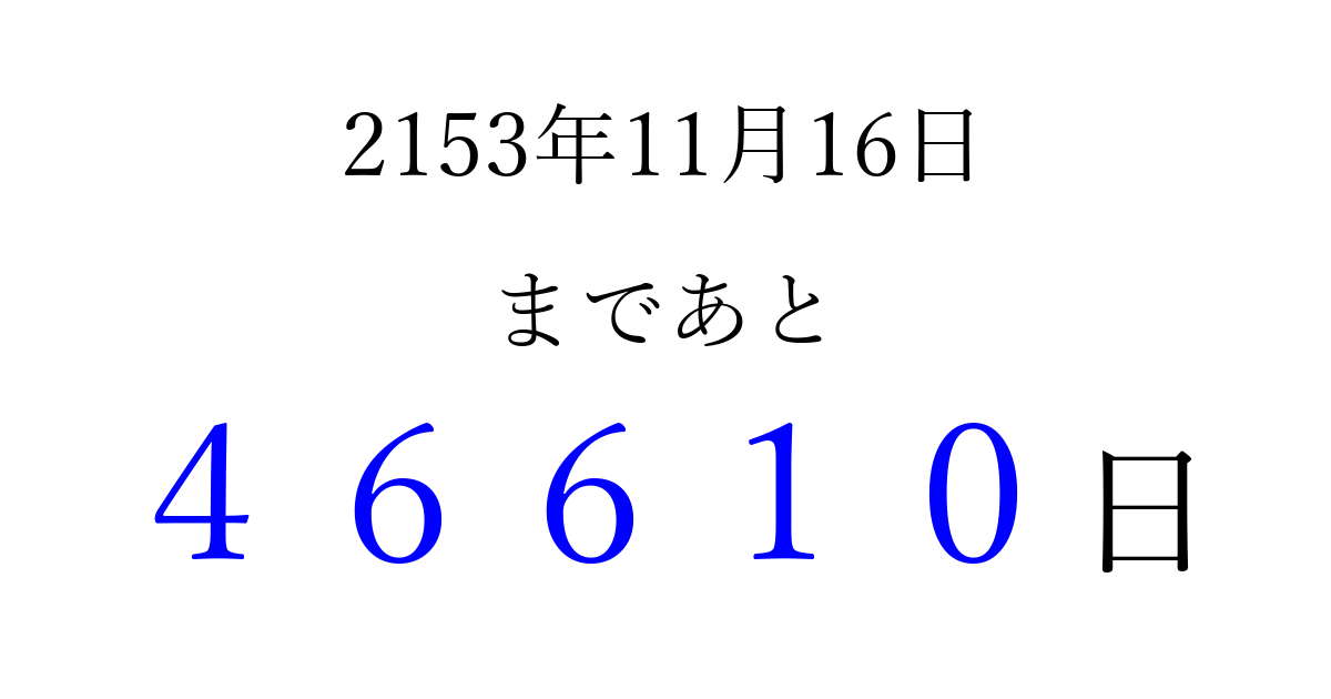 2153年11月16日(金)まで あと 99999 日です 追加すると、トップページからすぐ選べるようになります ※2026/04/06現在の結果です。 最新の状態に更新する ↓シェアして、タイムライン上にカウントダウンを表示しよう!↓ 📤 この結果を共有する Tweet シェア Threads Bluesky 別の日付でカウントダウン 2153年11月のカレンダー このページをブックマークに追加すると、いつでもカウントダウンを確認できます。 (PC: Ctrl+D / Mac: ⌘+D) hitome-notes.comでは以下のページも運営しています。 指定日と期間から日付を計算 | ガチャ確率計算・シミュレーション | プライバシー・ポリシー 運営者:Avocado